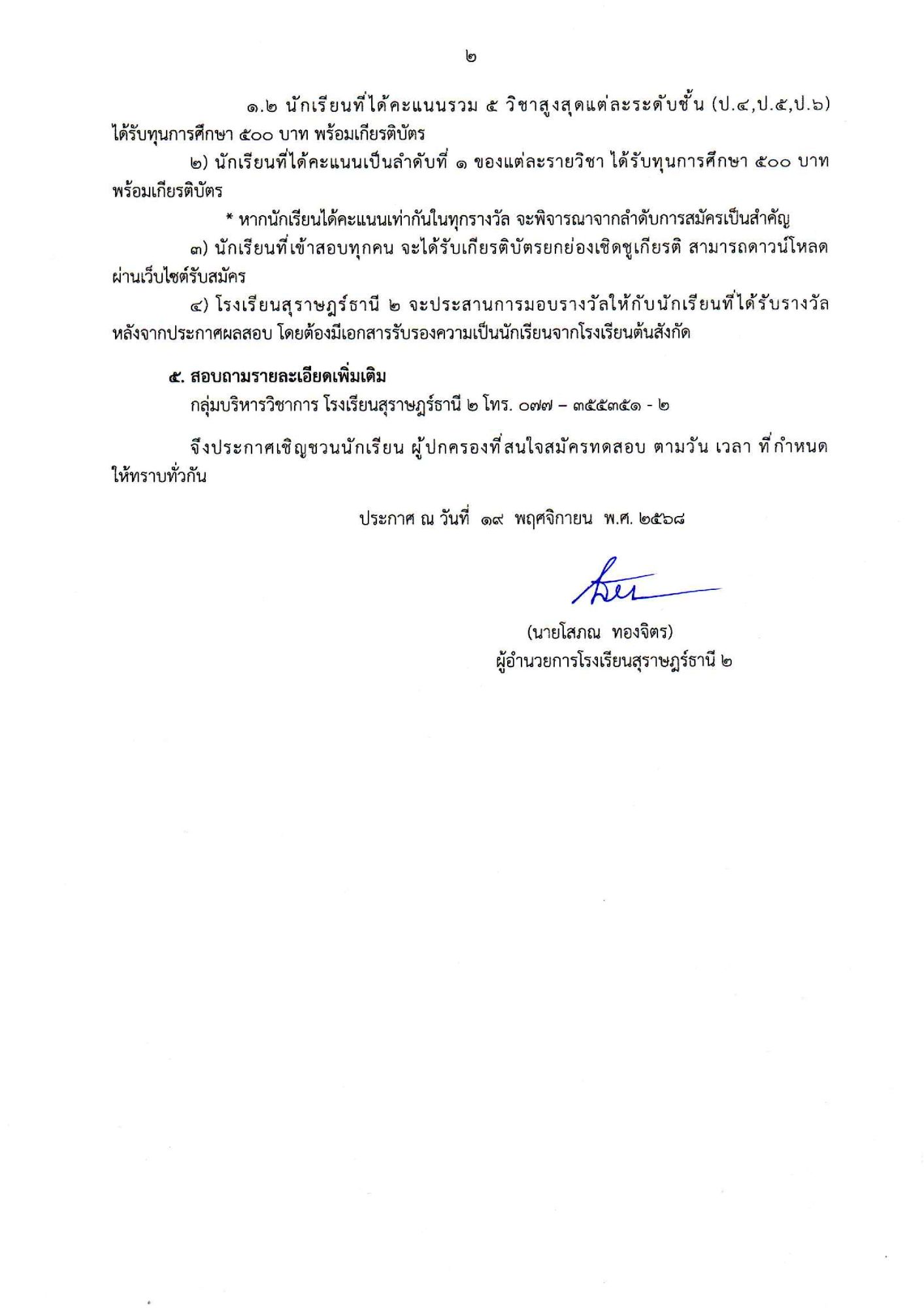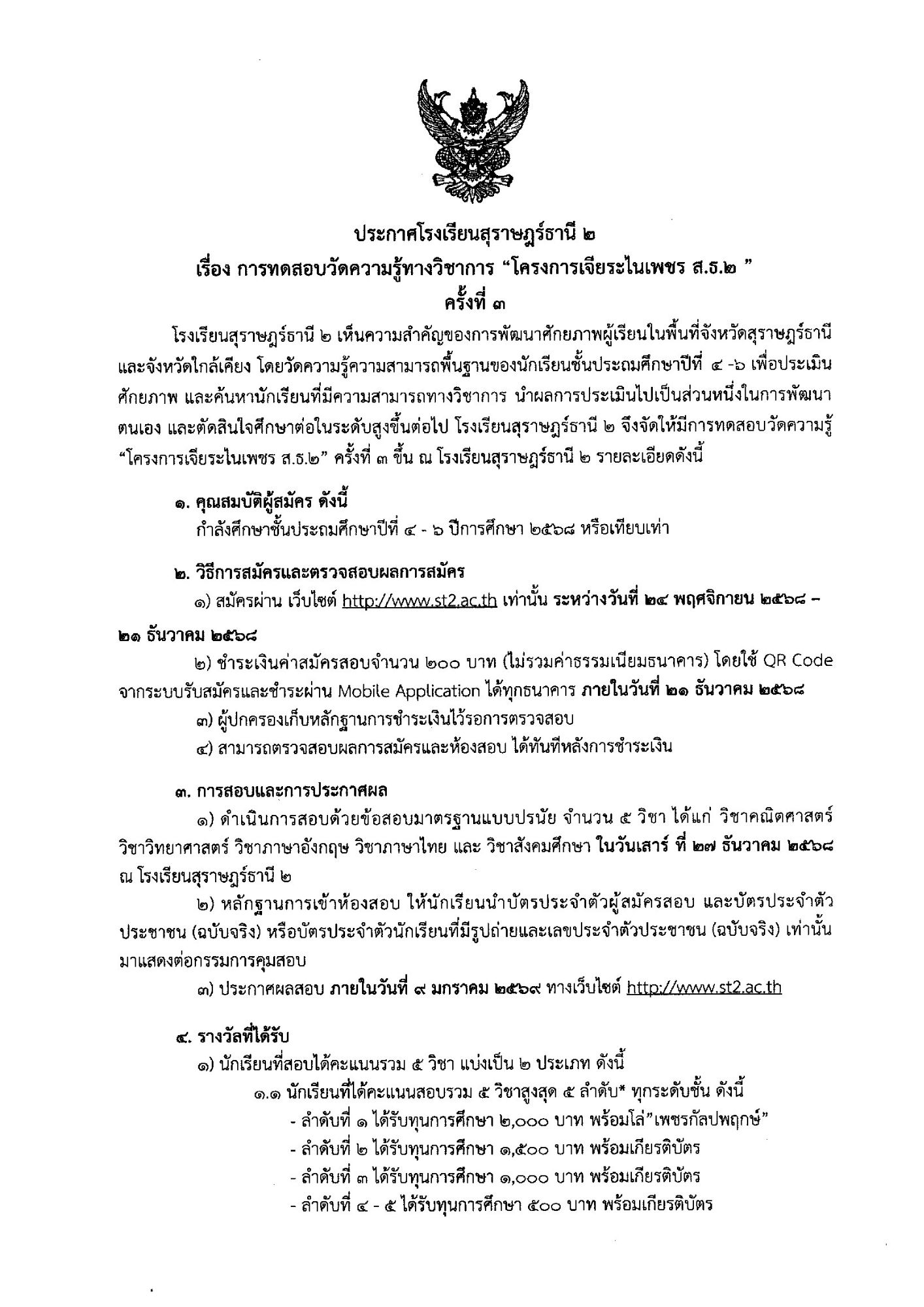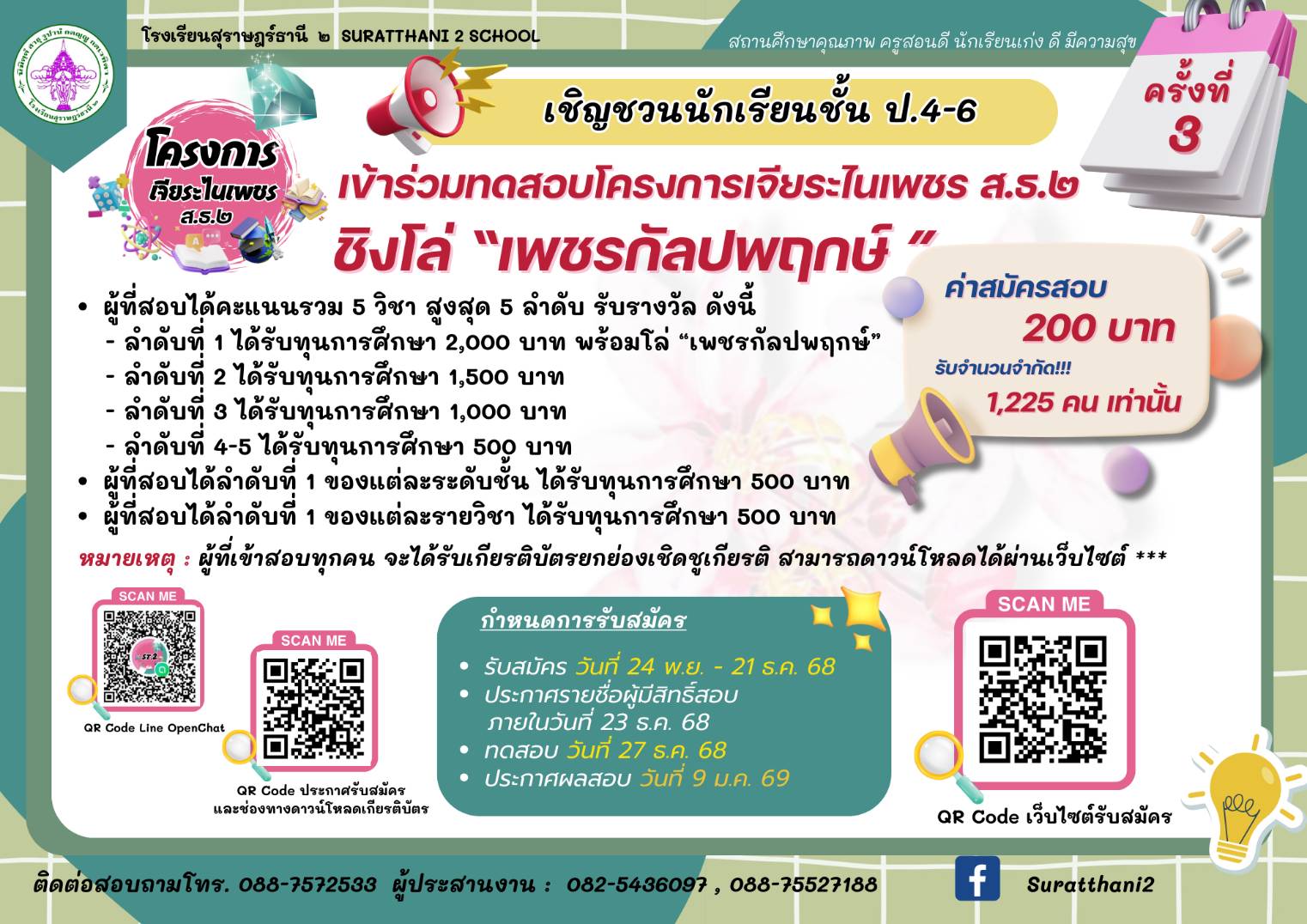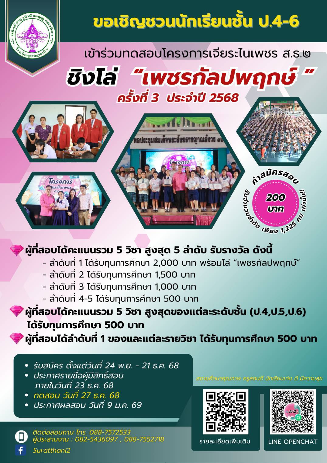 🔔 โรงเรียนสุราษฎร์ธานี ๒ เปิดรับสมัครสอบวัดความรู้ ชิงทุนการศึกษาพร้อมรับโล่ “เพชรกัลปพฤกษ์” สำหรับนักเรียน ป.4 - ป.6 โครงการเจียระไนเพชร ส.ธ.๒ ครั้งที่ 3 ประจำปี 2568
